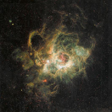 Get Google Newsfeed on the topic: Most prominent of the gas clouds is the Tarantula Nebula, at upper left, so named because of its spidery loops.